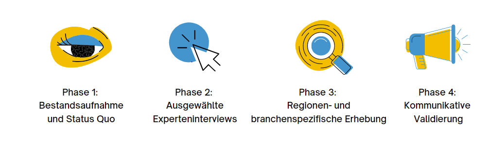 Im finalen Schritt werden in Phase 4 die gewonnenen Erkenntnisse unterschiedlicher Regionen und Branchen aus Phase drei kommunikativ validiert, indem sie mit ausgewählten Fokusgruppen in Form von Workshops und weiteren offen gestalteten Interaktionsformen analysiert werden. Dieser Schritt dient dazu, die Ergebnisse aus den Analysen zu verifizieren und eine möglichst vollumfassende Darstellung aus der Forschung und Praxis zu generieren.